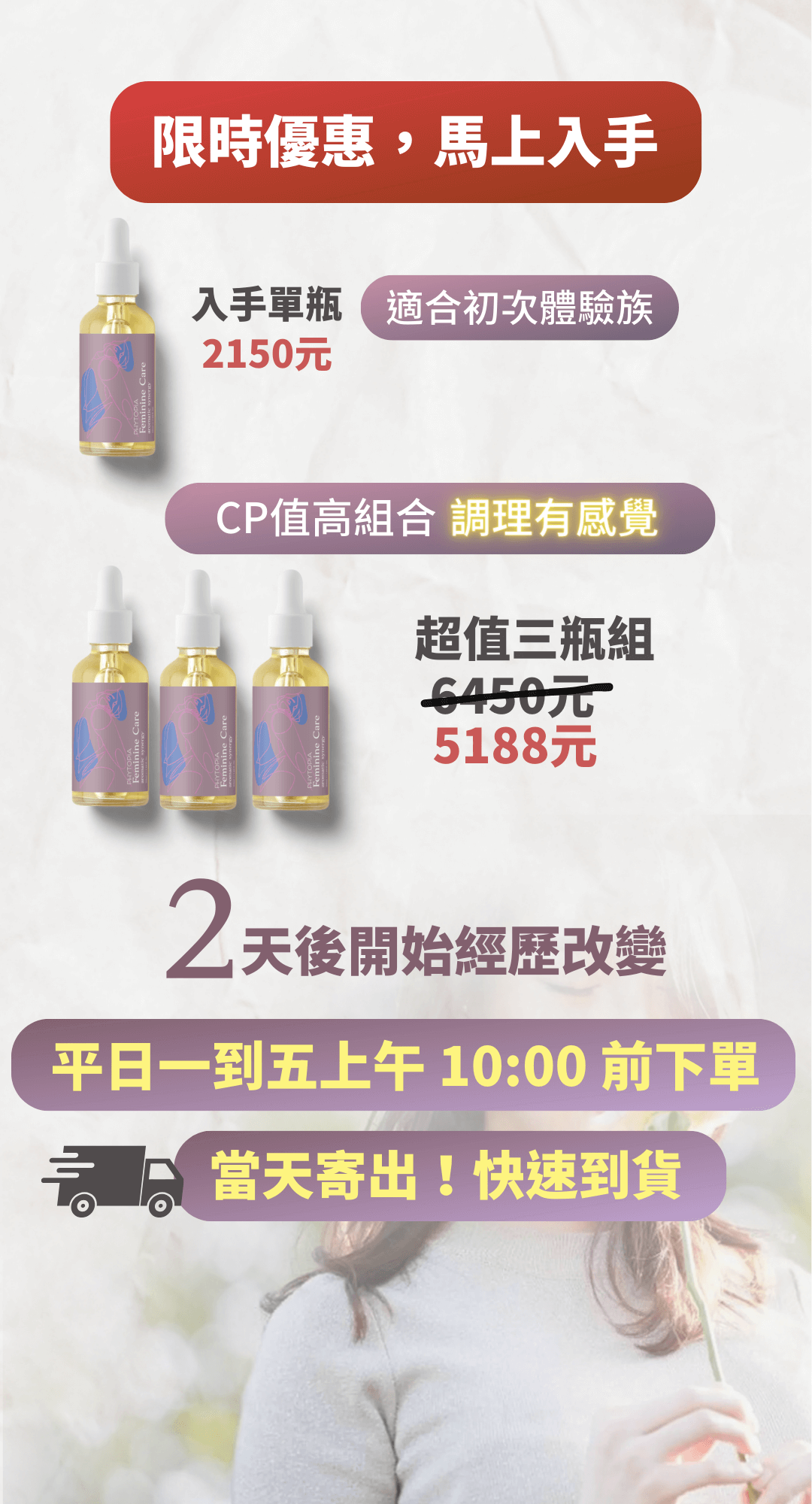 ① 平日:每天晚上使用一次,取 5 滴塗抹於下腹部,亦可按壓於私密處