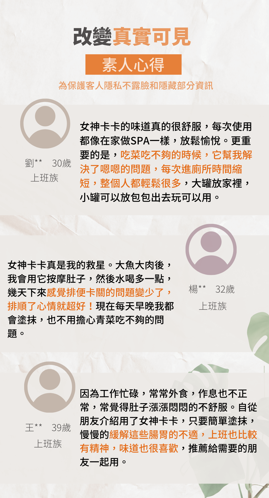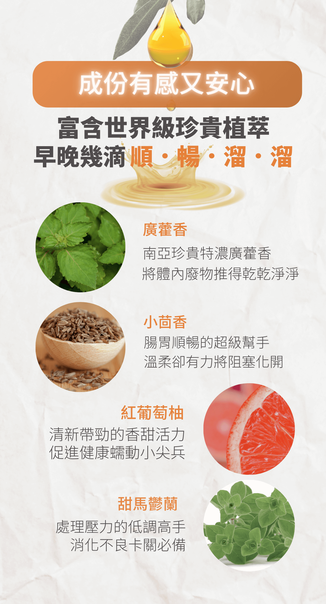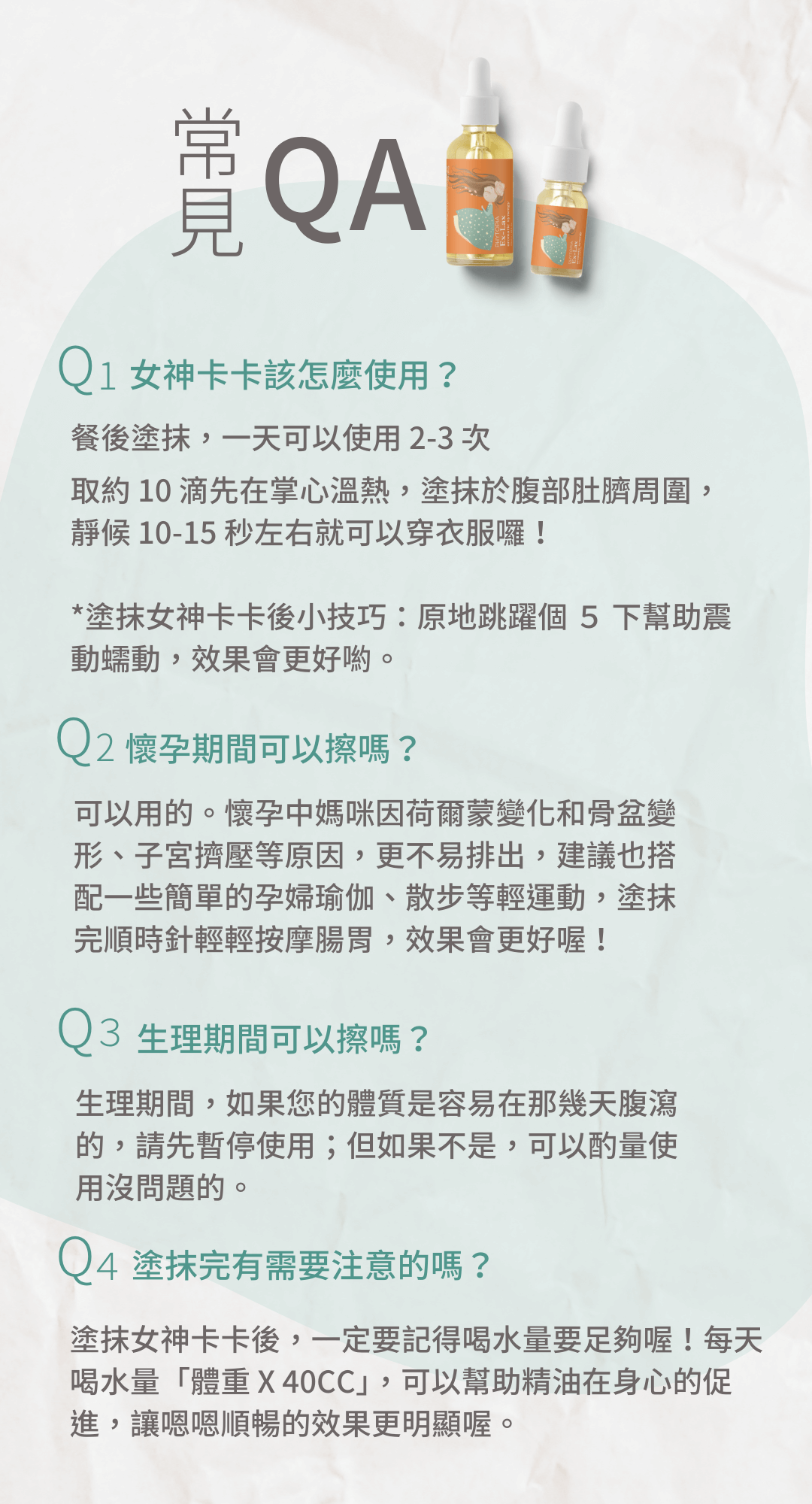 ① 每餐飯後 30 分鐘,取 10 滴塗抹於整個腹部,吸收後原地跳躍五下即可