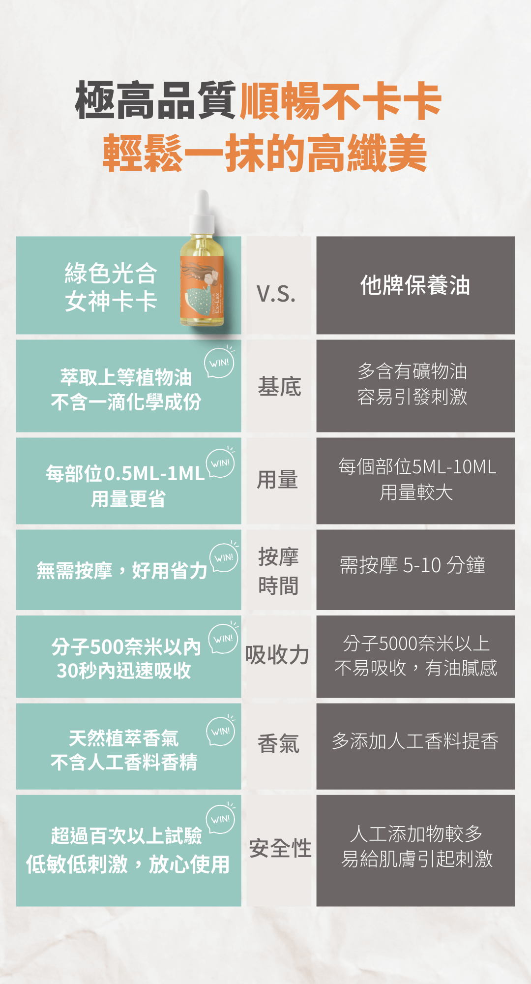 初榨橄欖油、杏仁油、蓖麻油、百里香、廣藿香、甜馬郁蘭、小茴香、葡萄柚