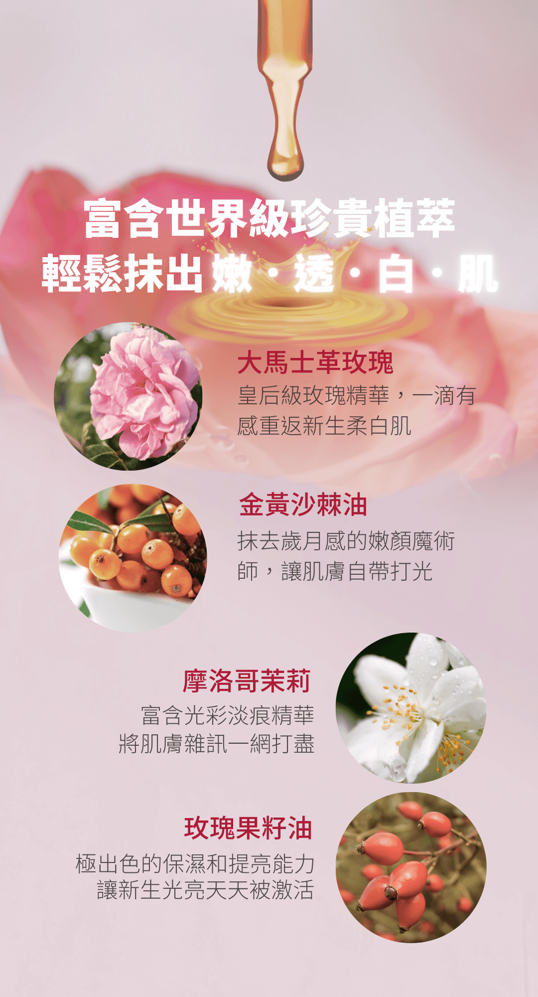 摩洛哥堅果油、沙棘油、玫瑰果油、大馬士革玫瑰、摩洛哥茉莉、岩蘭草、甜橙
