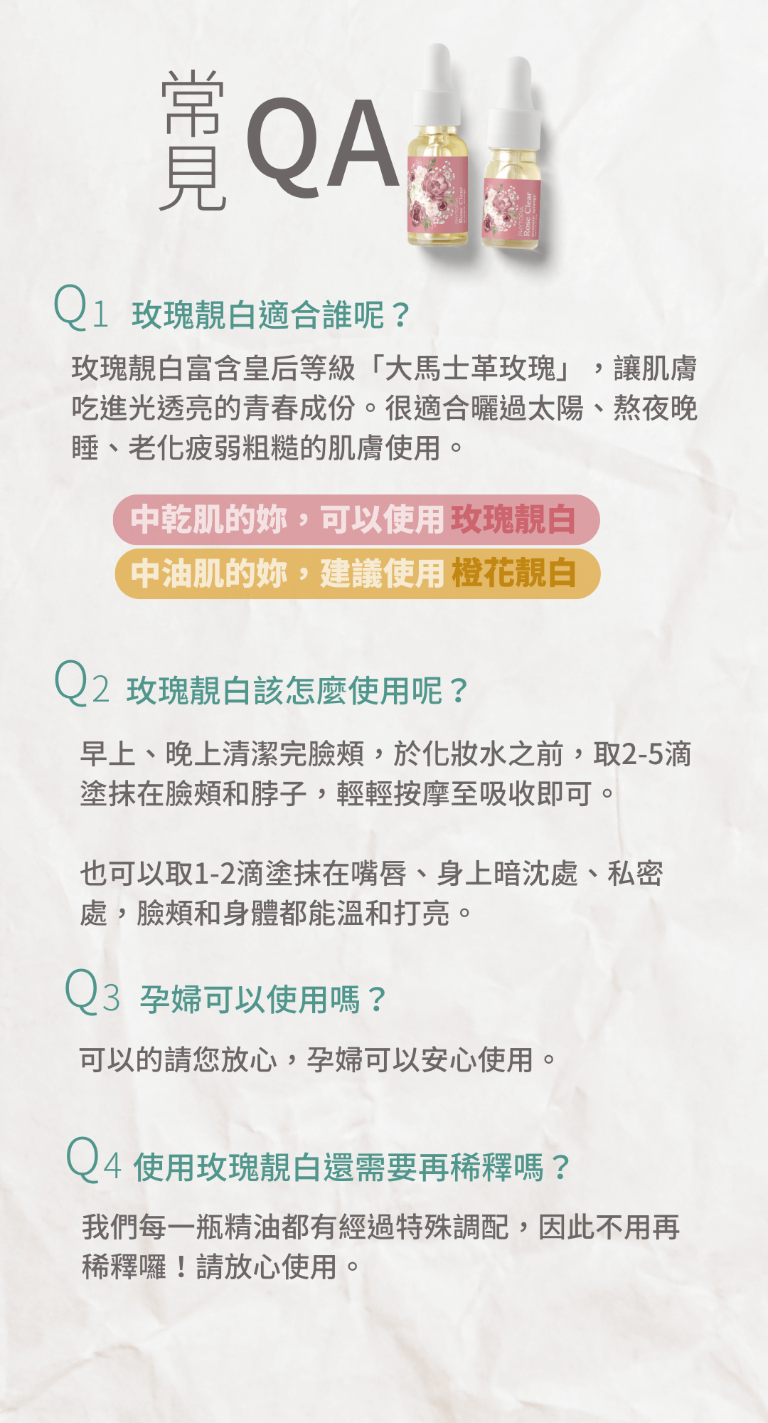 ① 中乾性肌膚:於化妝水〈前〉使用,取 2-3 滴於掌心搓揉溫熱後,按壓於全臉