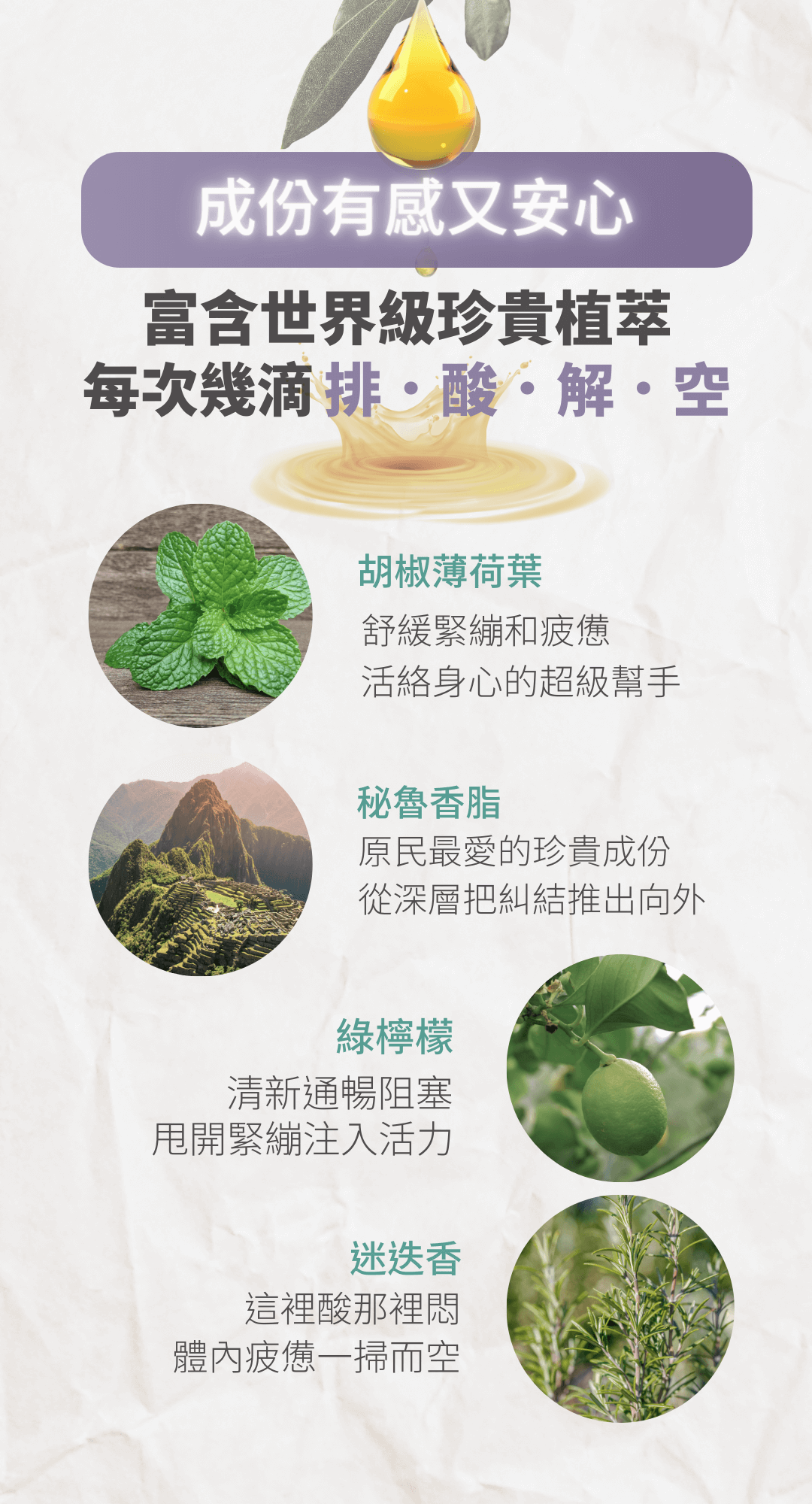 荷荷芭油、月見草油、向日葵油、胡椒薄荷、祕魯香脂、澳洲尤加利、爪哇香茅、迷迭香、檸檬、薰衣草