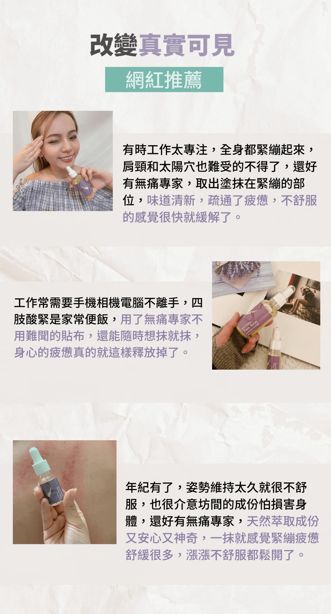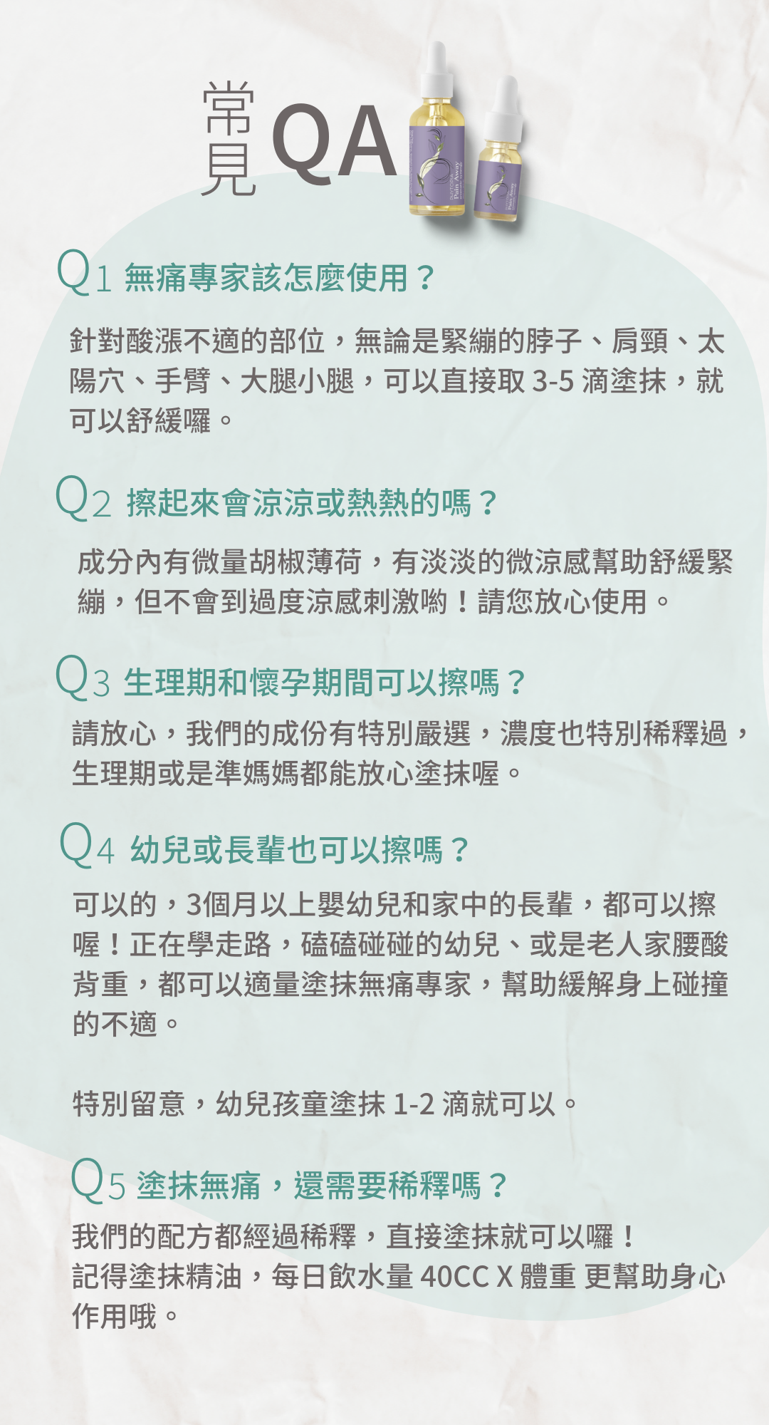 ① 每日睡前,或需要時,取 10 滴均勻塗抹於緊繃部位,塗抹至吸收 (約 10-30 秒) 即可